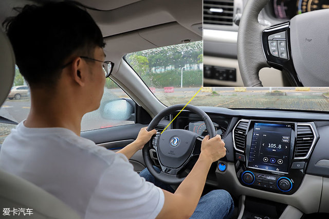 三辐式方向盘由真皮包裹,多功能控制按键区域面板则使用了钢琴烤漆。方向盘盘径适中,握感一般,有一定旷量。