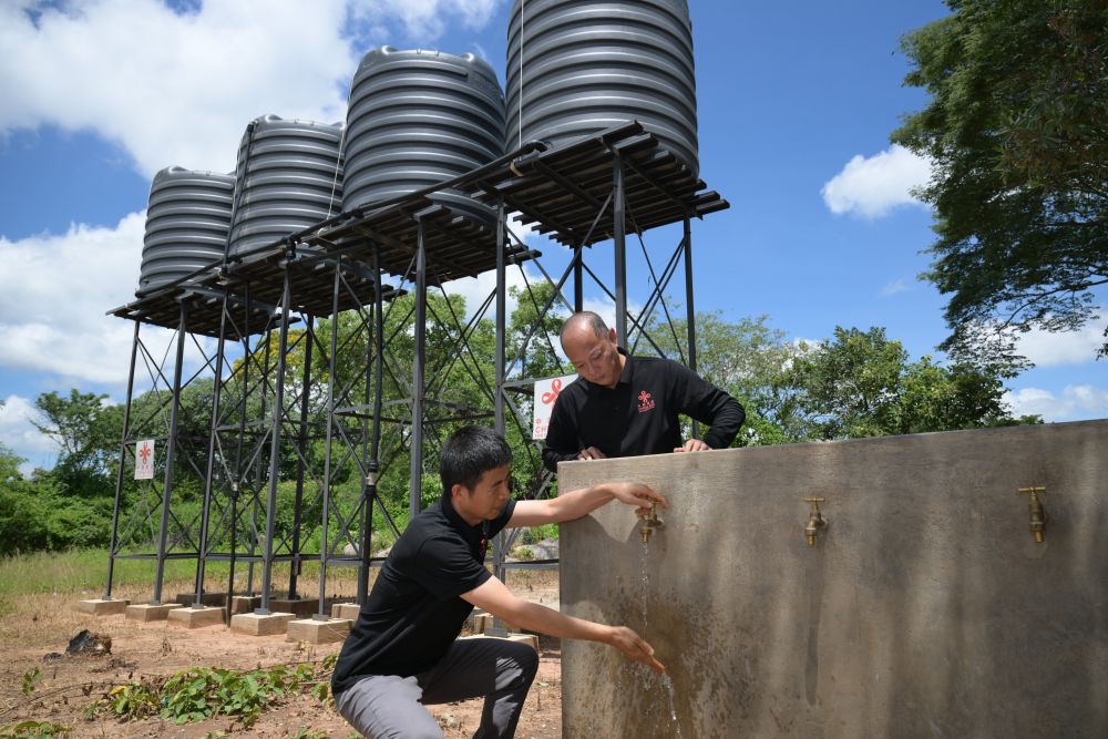 1月26日,在津巴布韦中马绍纳兰省沙姆瓦地区津迪村,中国援津第四期高级农业专家组专家在一处储水点检查水龙头。新华社记者 杨光摄