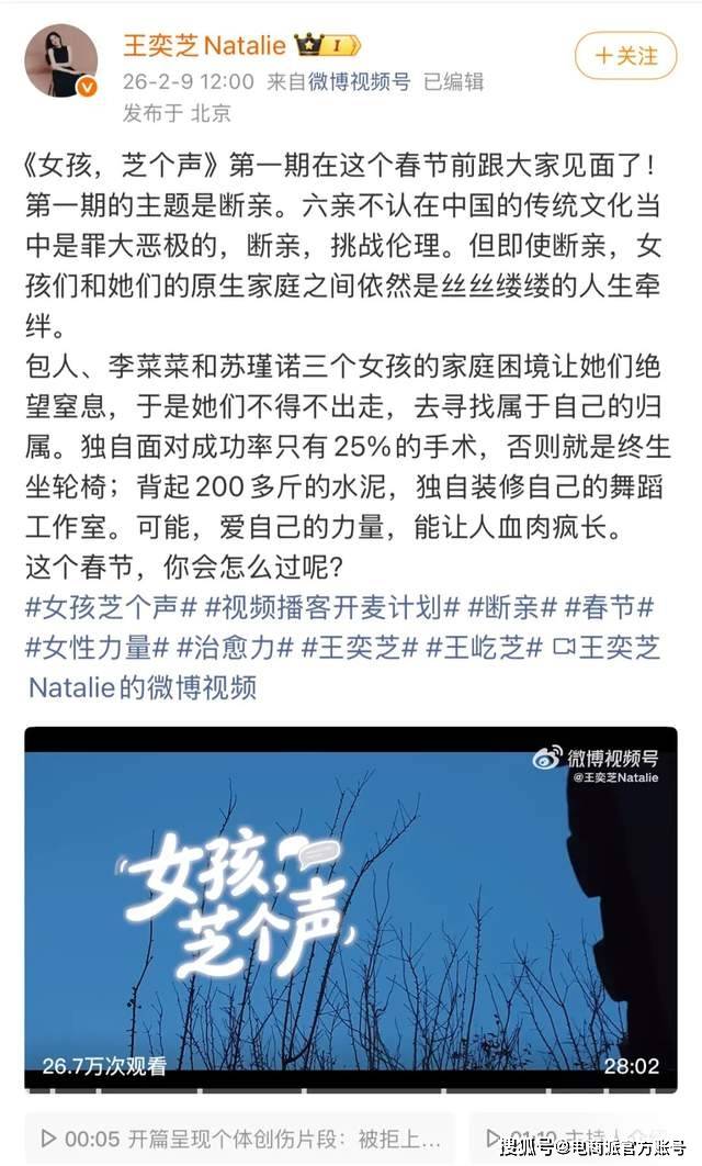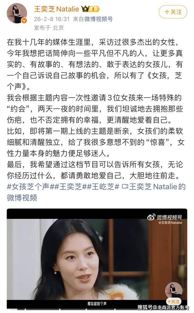 近日,蔚来汽车创始人李斌的妻子王奕芝发微博宣布将推出女性纪实访谈节目“女孩,芝个声”。至于做这个节目的原因,她表示,今年我想把话筒伸向一些平凡但不凡的人,让更多真实的、有故事的、有想法的、敢于表达的女孩儿,有一个自己诉说自己故事的机会,所以有了《女孩,芝个声》。