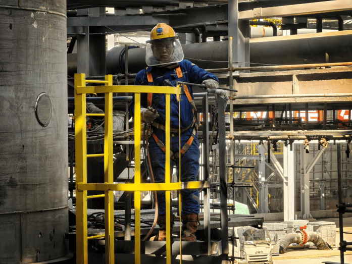 在十六化建浙江金塘项目现场,铆工默默坚守一线,正严谨的安装直爬梯护栏,将“安全第一”落到实处,以高度的责任感保障工程稳定推进。